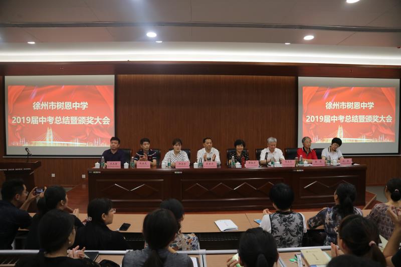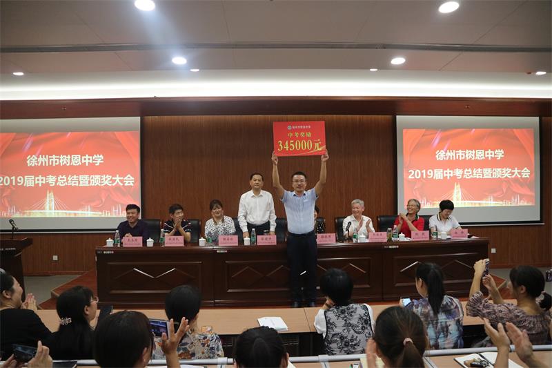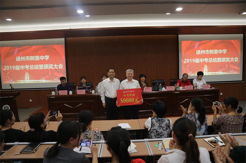 2019年9月27日下午,徐州市树恩中学2019届中考总结暨颁奖大会在高铁校区第一阶梯教室隆重举行,全体初中教师和高中部分教师参加了会议。刘永生校长主持大会。薛淑萍校长作了总结报告,对2019年中考工作进行总结,对2020年中考进行动员部署。徐州市宝润实业集团张爱萍董事长代表集团对取得优异成绩的中考团队颁发了奖金。原九年级部主任石院老师、现九年级部主任窦道洲老师、高铁校区八年级部主任卢振锦老师、高一年级部主任程建军老师分别代表年级部老师作了大会发言。